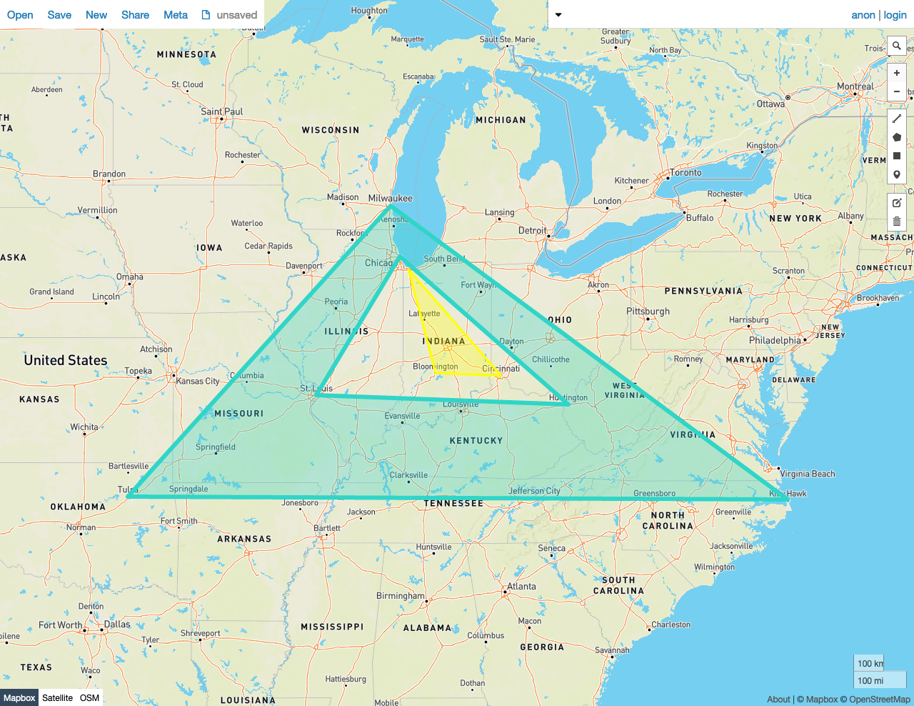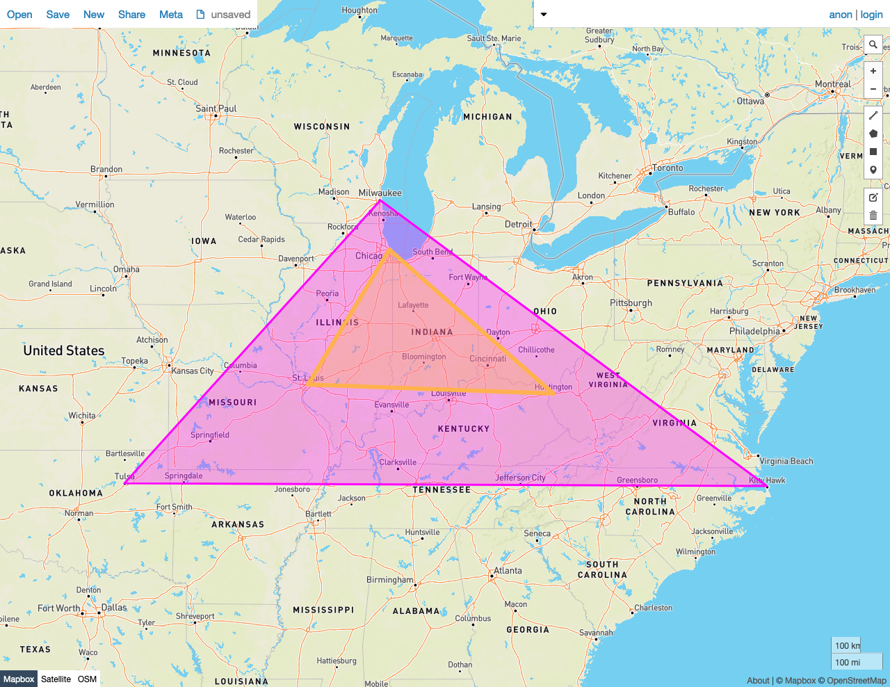 The screenshots in these examples were generated using geojson.io, but they are designed to showcase the shapes, not the map. Representing GEOMETRY data in GeoJSON can lead to unexpected results if using geometries with SRIDs other than 4326 (as shown below).